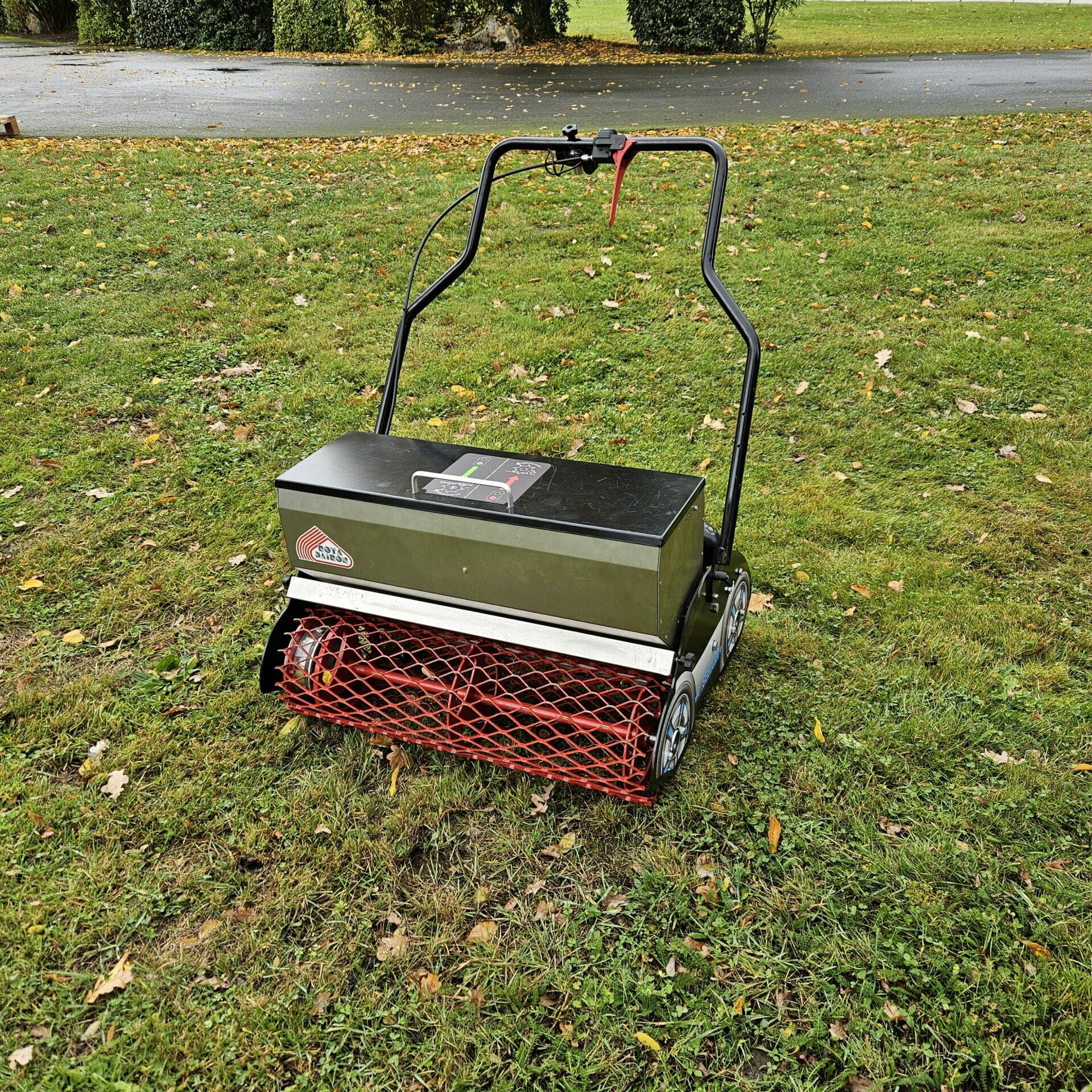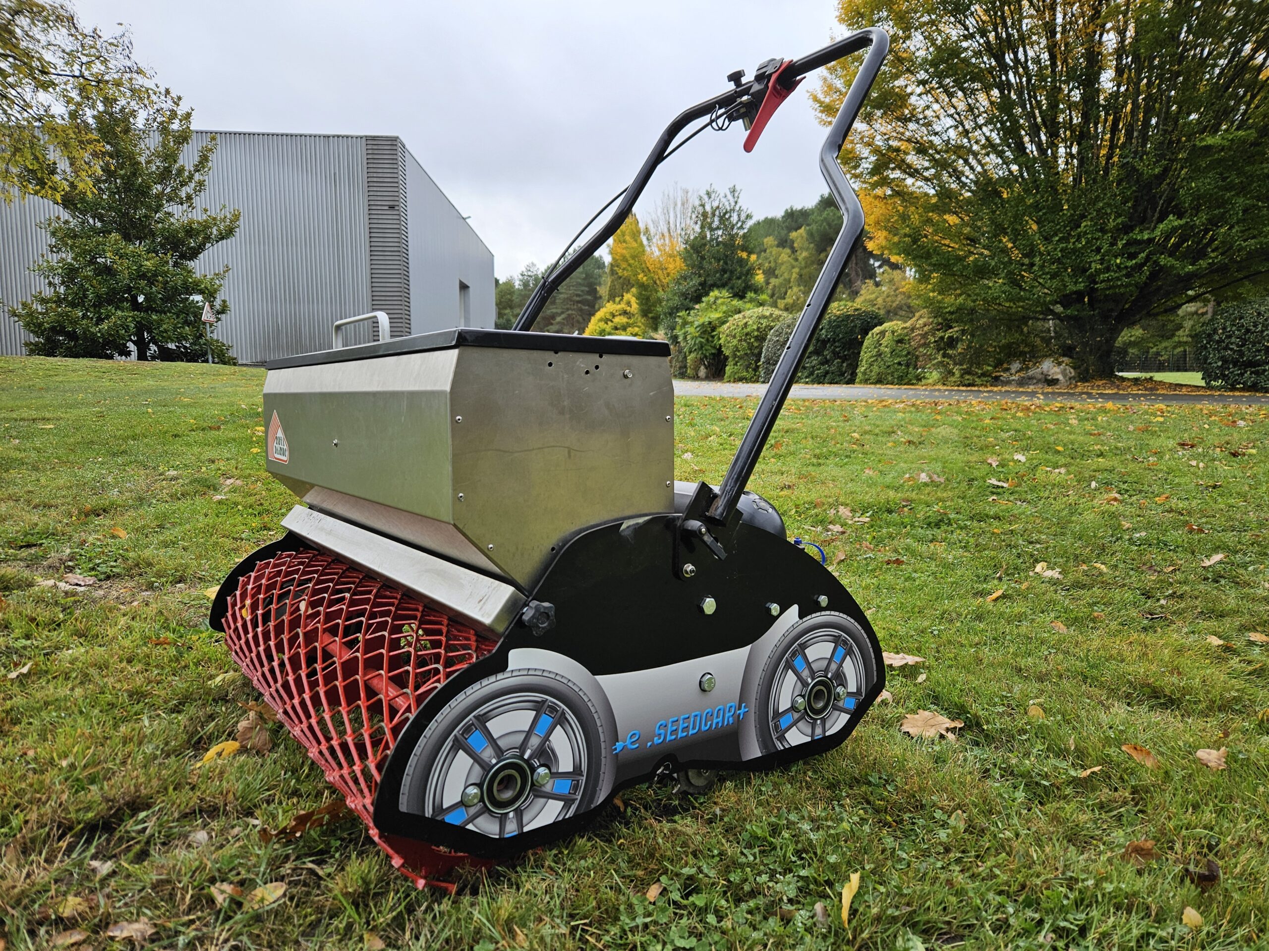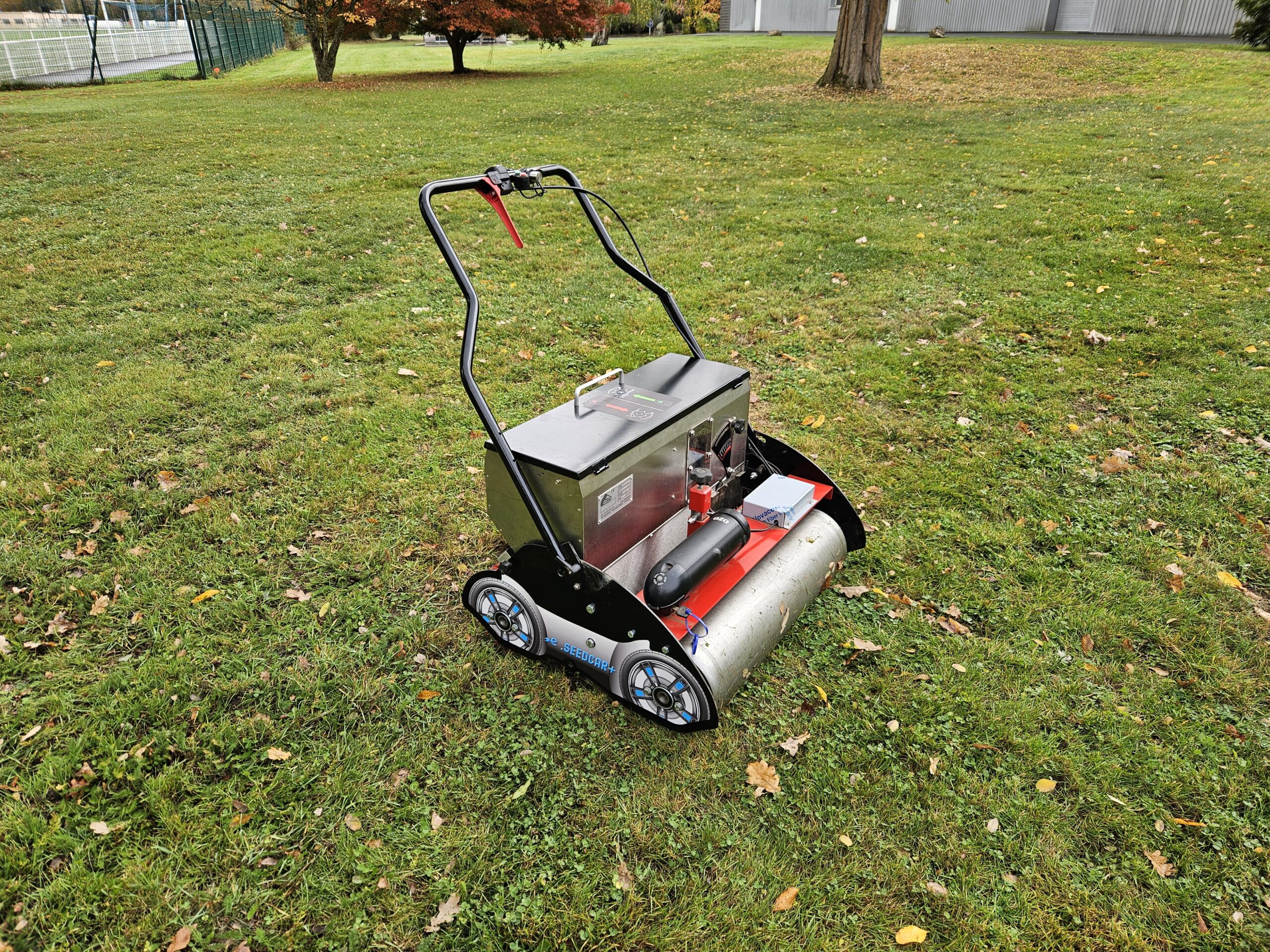 Le Rotadairon® e.SEEDCAR + est équipé d’un semoir à gravité et est conçu pour engazonner tout type de terrains, y compris les terrains difficiles ou d’accès étroits.